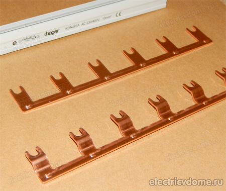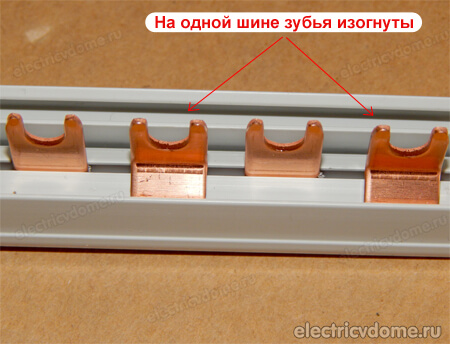 В двухполюсной гребенке на каждой шине расстояние между зубьями будет больше, нежели у однополюсной. Это связано с тем, для подключения к этим гребенкам подводится два питающих провода, фаза - нуль (L+N) или фаза - фаза (L1+ L2) и зубья на каждой шине должны идти как бы через один.