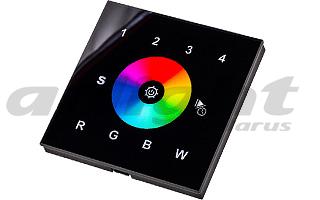 Встраиваемая стеклянная черная Touch-панель с сенсорным кольцом, раздельная регулировка 4 каналов - R,G,B,W. Управление 4 зонами по радиоканалу. Питание 220В. Работает вместе с контроллером SR-1009xx. Размер 86x86x29 мм